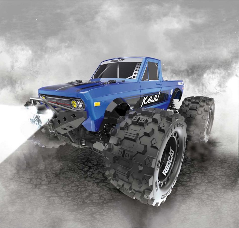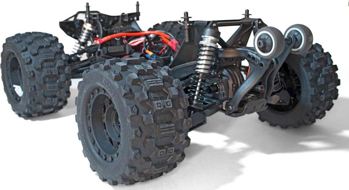 - CHASSIS & SUSPENSION: A sealed drivetrain keeps the dirt out and the grease in. Internal metal differential gears offer long lasting smooth diff action. Heavy duty captured ball ends are designed for minimal slop and extreme durability, to ensure you remain in control. Heavy duty steel CVA axles are standard on this 1/8 scale monster. The Kaiju includes aluminum body adjustable coil-over shocks with threaded body. An adjustable wheelie bar allows for crazy stunts.