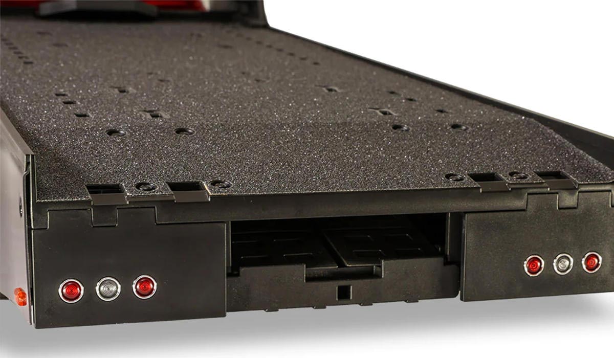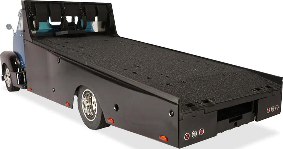 - The bed features an anti-skid surface, wheel chocks, and tie-down straps to securely transport your precious RC vehicles. The cleverly concealed easy-load battery box adds to the convenience.