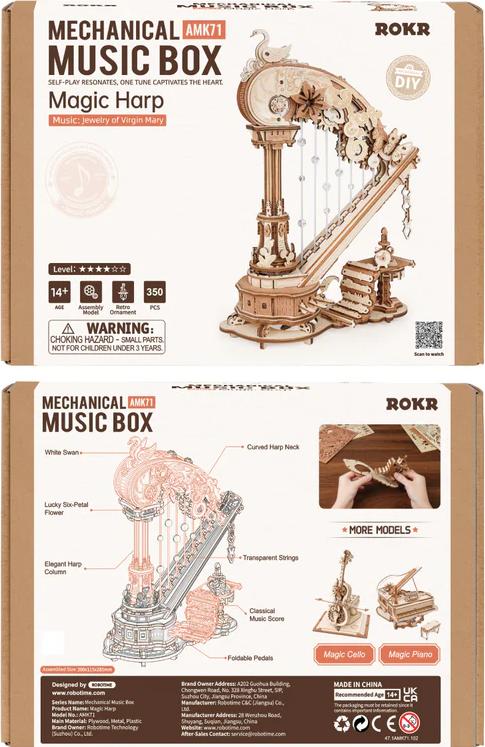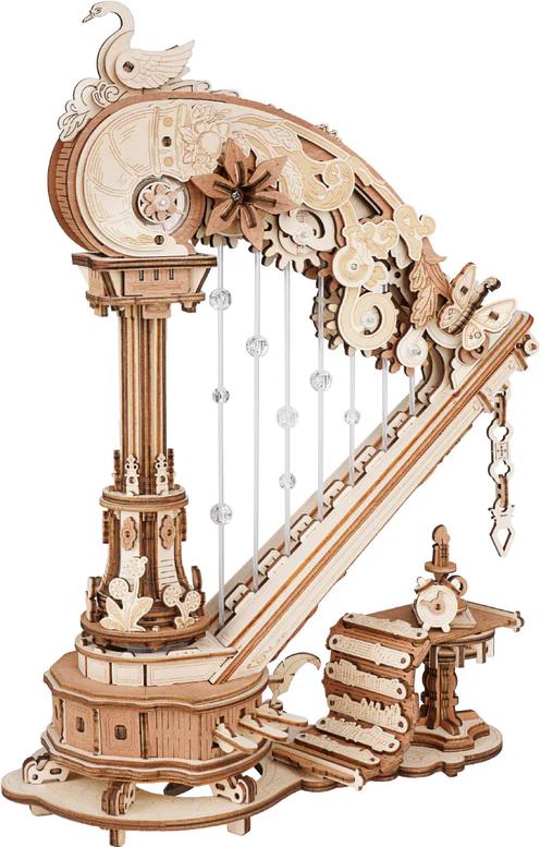 Let the ROKR Magic Harp transport you to a world of tranquility and inspiration. This self-playing music box captivates not only with its enchanting melody but also with its exquisite design and elegant motion. Inspired by 18th-century harps, the instrument features vintage pedals and a gracefully curved neck, adorned with Rococo-style details, including a cornucopia of fruits and flowers, a butterfly, a six-petal bloom, a rotating Roman column, a graceful swan, and a hanging chain.The exposed multicolored gears move in perfect harmony, creating a smooth and gentle animation. It is said that angels play harps, and this heavenly sound, combined with the stunning design, brings calm, inspiration, and a touch of peace to your everyday life.