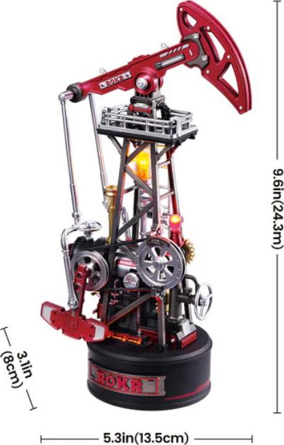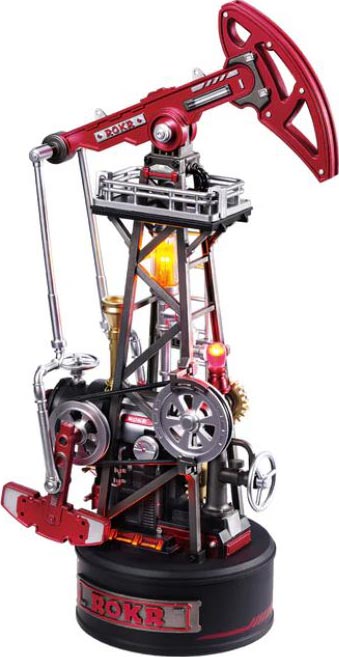 The Oil Pump Jack's exposed gears, LED lamps, and red-and-silver metallic coloring create an industrial look.