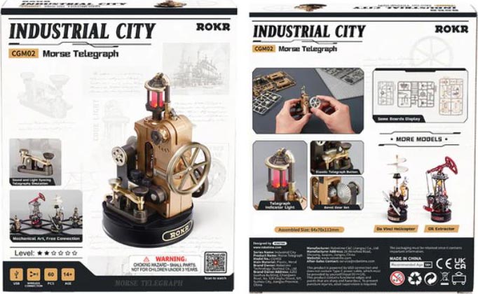 Rediscover fascination for long-distance communication by going back to its roots. The ROKR Morse Telegraph revives the magic of analog technology with synchronized clicks and flashing lights that will make you appreciate WiFi and computers more. Decode messages, play spy games, or simply learn Morse code with good old-fashioned patience and 19th-century mechanics. This miniature telegraph is designed with an indicator module, power wheel module, and button module for a realistic feel for discovery and innovation.The ROKR Morse Telegraph is part of the Industrial City Series, a group of machines that can be interconnected through a power base hub or a wireless connection.