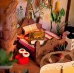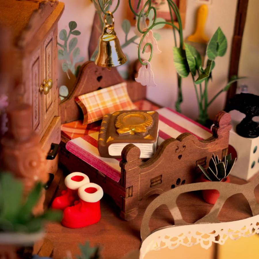 Nestled deep within the forest is a tiny tree house tucked inside a hollow tree trunk. Tiny woodland creatures live here, using people's lost or discarded items as fixtures and furnishings. A strapless watch becomes a wall clock, a pair of dice serve as small tables, and a funnel transforms into a stove hood. Thanks to the woodland residents' ingenuity, this simple two-story home has everything: wooden furniture, a snug bedroom, a kitchen, a dining area, appliances, wall décor, potted plants, a mushroom garden, and even a swing. What more could you need when nature is your neighbor and cuteness your companion? Come, build and tell the story of this cozy forest residence, then switch on the LED lights to turn your project into a delightful display.
