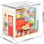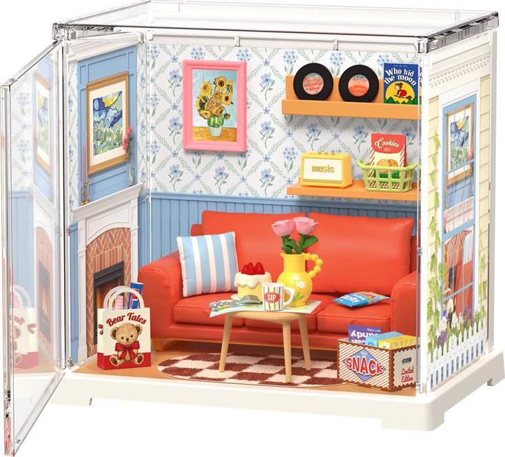 Relax and unwind in this cozy blue room, complete with a retro vibe and vintage touches. The Country Blue Lounge lets you rest on its big red sofa and snack on some sweets while soft music plays in the background. The floral blue wallpaper stands out with its nostalgic design, while vinyl records and a vintage radio sit on the shelves. Afternoon warmth seeps in through the wide window as well as from the fireplace.?Calm and stylish, the Rolife Country Blue Lounge is a great decorating piece from the Mini Super Creator Series. It includes a dust cover so you can display your miniature anywhere without worrying about dust and frequent cleaning. Try this quick build that you can create in one sitting!