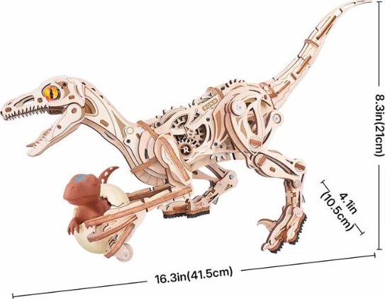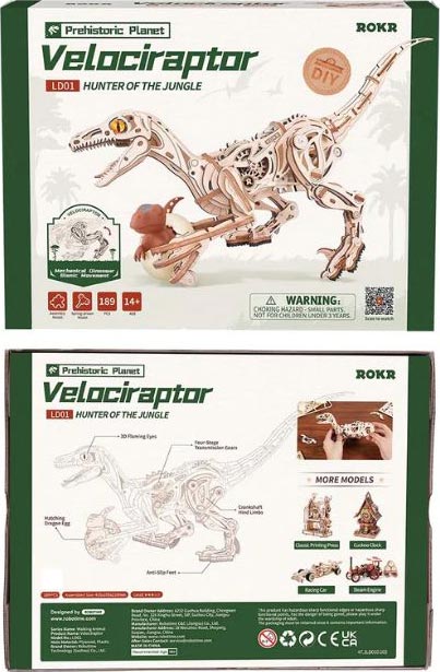 Let's travel 65 to million years back and encounter the Velociraptor, a medium-sized dinosaur feared by others. It's fast, sleek, and feeds on the young of other mammals, running away swiftly using its formidable hind legs while clutching its catch. ROKR showcases this fascinating predator through a mechanical wooden kit fitted with a powerful 4-stage gear transmission system, enabling toe walking and dynamic running. The 106-part structure features rubber pads beneath the Velociraptor's feet, which provide traction and padding, and metal springs behind each foot that simulate tendon function. Fiery, amber eyes, specialized front claws, and rows of sharp teeth complete its fierce look. ROKR follows nature's design of the dinosaur's S-shaped tail that balances its heavy front.