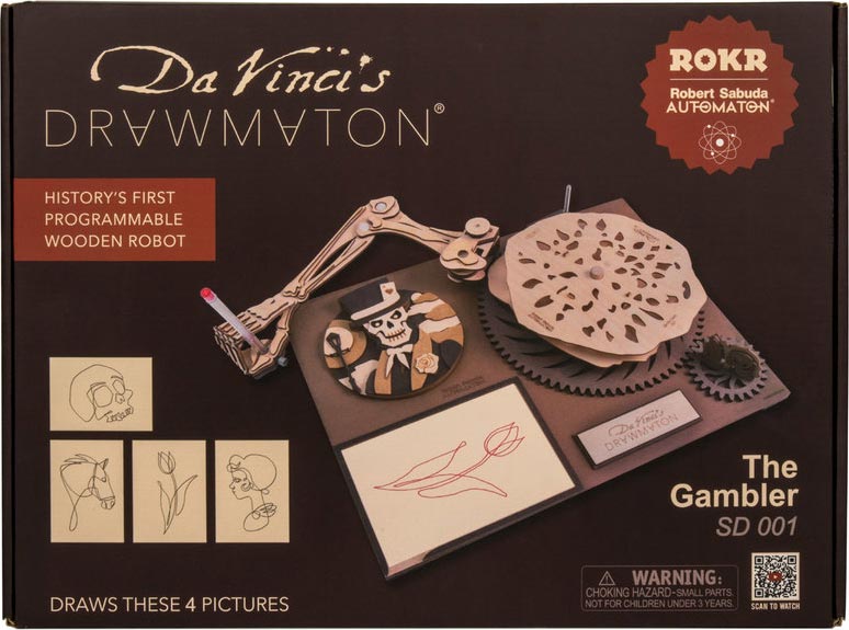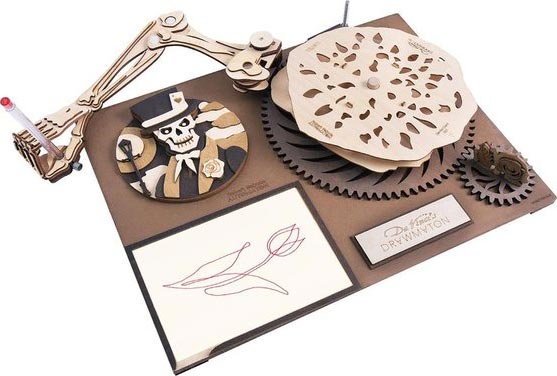 Drawing board: You can draw 4 photos (four wooden petals). A set of schedule petals stores 1 kilo bit of predefined move date. When the petals complete a full rotation, the information is sent up the robot arm and into the hand, drawing an image.