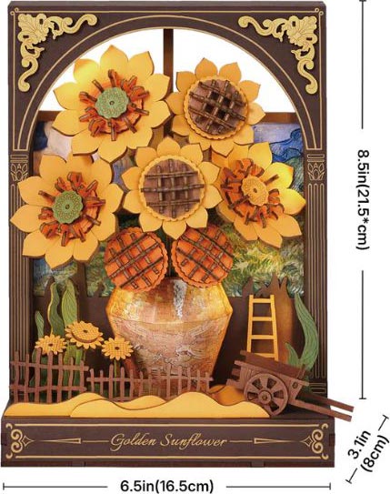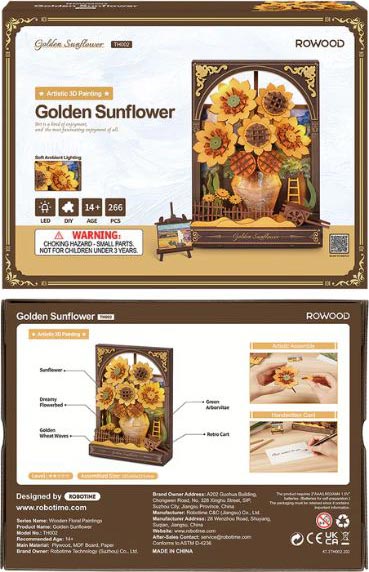 Flowers that never wilt, joy that never fades. Rowood presents an ever-smiling floral arrangement in the Golden Sunflower, a tabletop ornament and night light puzzle with 266 accurate pieces. Let this kit's layered petals, textured leaves, and vibrant aura always give you a reason to smile. Made of choice, sustainable wood and treated with the latest in coloring technology, this DIY shelf decoration is oozing with realism, warmth, and light. It's the perfect desk decoration, ambient light, weekend project, or gift for her who needs a little brightness to their day. There may be cloudy days, but Rowood will always give you sunshine to build.