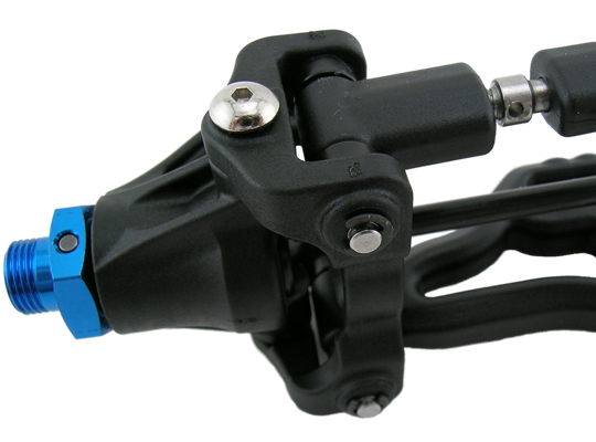 The spacers off to either side of both the upper and lower A-arms at the upright show the proper installation of the RPM Adapter Kit on a stock Losi LST2.
