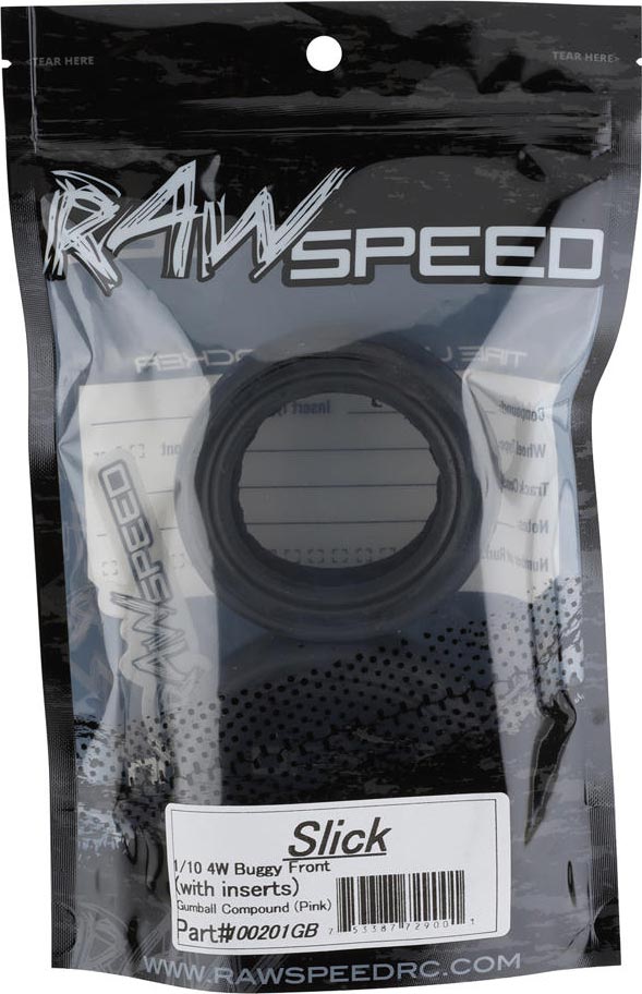 This is a pack of two Raw Speed Slick 2.2" 1/10 Front 4WD Buggy Tires with included Raw Speed inserts. These front tires are made a little wider to fit standard 4WD front buggy wheels.