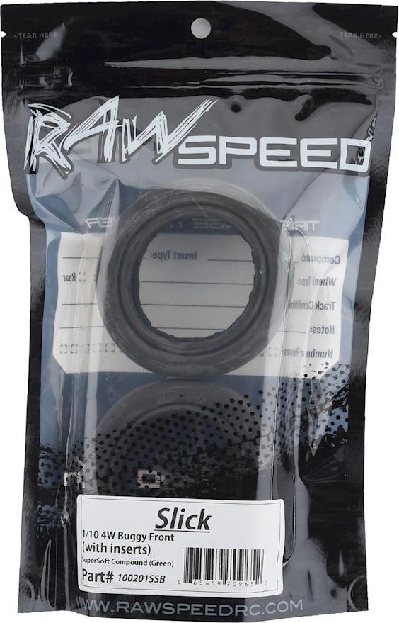 This is a pack of two Raw Speed Slick 2.2" 1/10 Front 4WD Buggy Tires with included Raw Speed inserts. These front tires are made a little wider to fit standard 4WD front buggy wheels.
