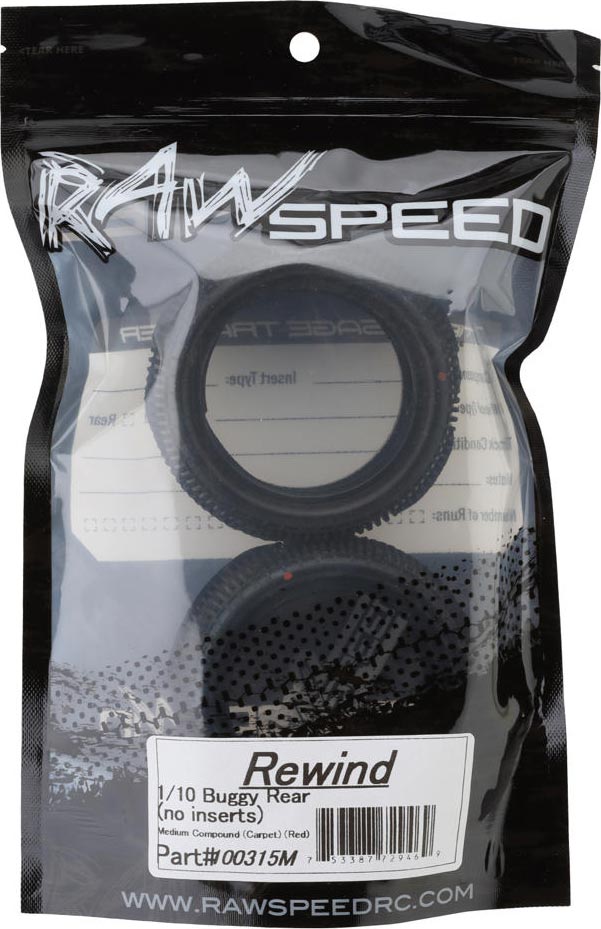 Raw Speed RC Rewind 2.2" 1/10 Buggy Rear Tires. Specially designed for indoor carpet 1/10 buggy racing and fits any industry standard 2.2” read wheels. Features small tight-knit tread molded with high quality rubber, these Rewind tires will give your buggy all the traction and the grip needed to handle and excel in indoor carpet racing.