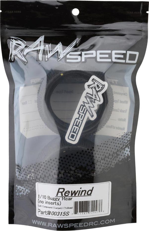Raw Speed RC Rewind 2.2" 1/10 Buggy Rear Tires. Specially designed for indoor carpet 1/10 buggy racing and fits any industry standard 2.2” read wheels. Features small tight-knit tread molded with high quality rubber, these Rewind tires will give your buggy all the traction and the grip needed to handle and excel in indoor carpet racing.