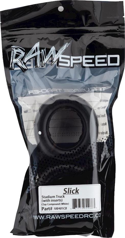Raw Speed Slick Stadium Truck Tires are designed for smooth high grip surfaces. Package includes two tires and high quality closed cell inserts.