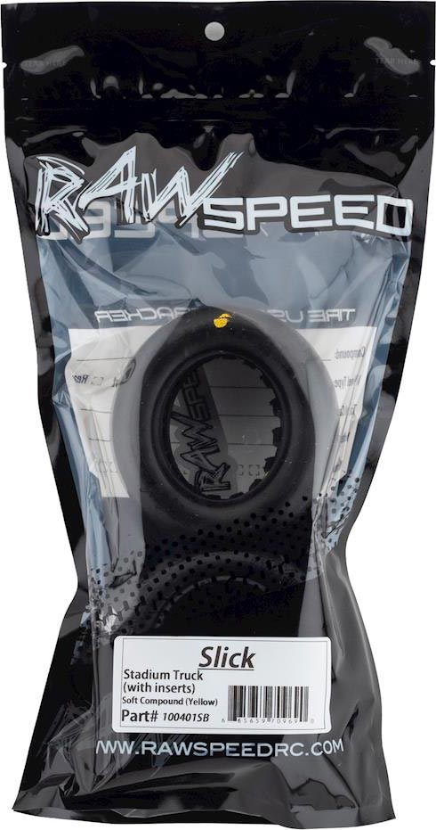 Raw Speed Slick Stadium Truck Tires are designed for smooth high grip surfaces. Package includes two tires and high quality closed cell inserts.