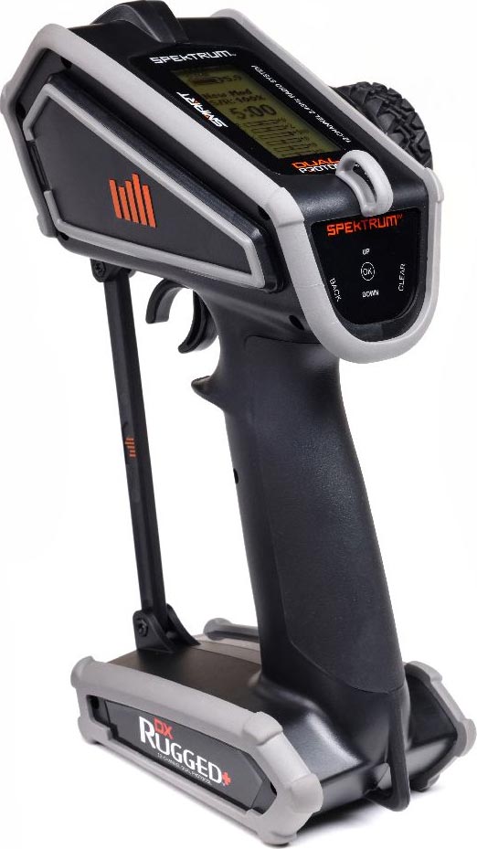 The DX Rugged+ is compatible and able to bind with SLT protocol equipped vehicles, such as the Losi NASCAR RC Racecars, ARRMA GROM small-scale bashers and Axial SCX24 micro crawlers. With this transmitter, you'll be able to drive SLT and DSMR protocol receivers with one transmitter. Dual Protocol means one perfect control.