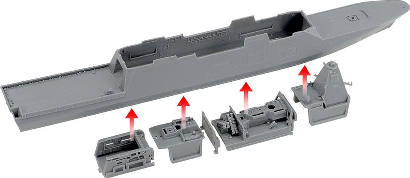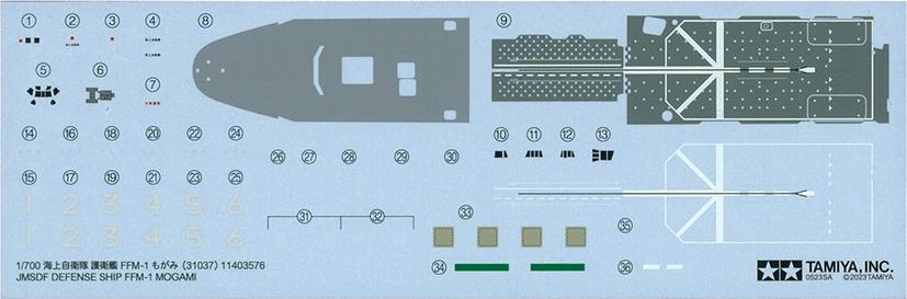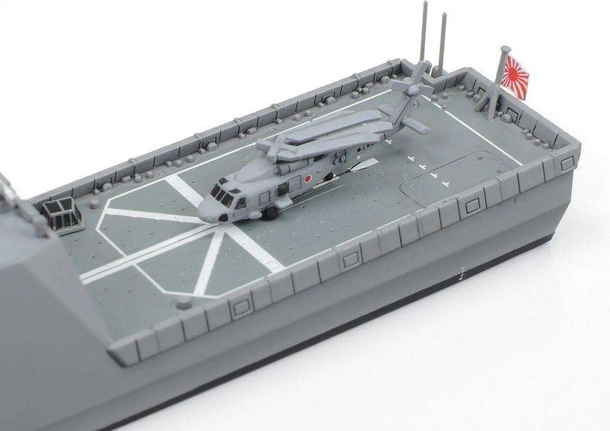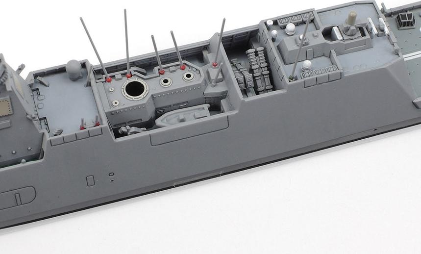 This model assembly construction kit recreates the JMSDF Defense Ship FFM-1 Mogami. The Mogami was commissioned on April 28, 2022, ushering in a new era of Japan Maritime Self-Defense Force (JMSDF) defense ships as the first of its eponymous Mogami class which was given a new FFM classification, signifying its ships’ status as frigates (FF) with a multi-purpose brief including mine(M)-related duties, and featured advanced stealth characteristics. The equipment under the rear flight deck can be taken from the stern hatch and utilized for minesweeping and marine patrol, while a slanted flight deck secures the space to store the