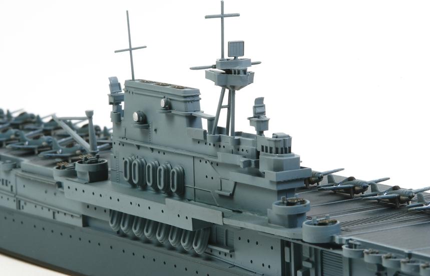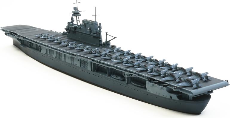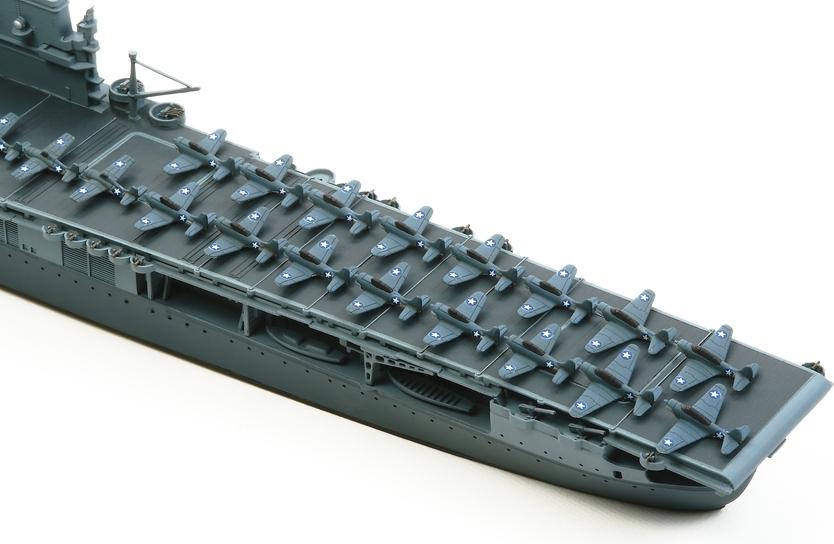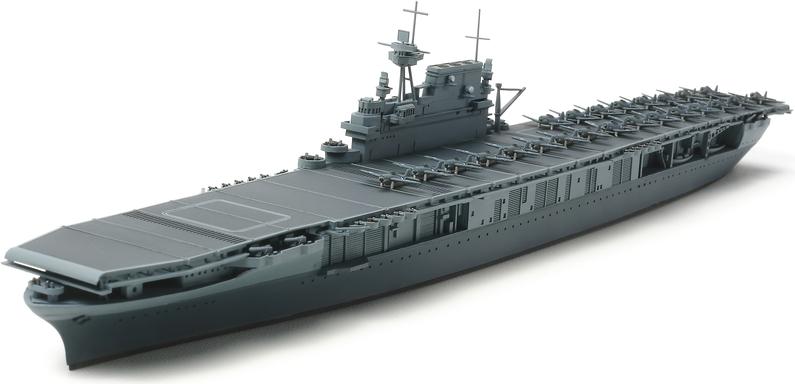 The USS Yorktown was completed in September 1937 as the first ship of her namesake-class and the U.S. Navy's sixth aircraft carrier. When the Pacific War broke out, she became the flagship of Task Force 17 under the command of Rear Admiral Frank J. Fletcher and conducted a number of operations around the Pacific. During the Battle of the Coral Sea in May 1942, she helped thwart the Japanese Navy's advance on New Guinea despite suffering severe damage. Subsequently, at the Battle of Midway, the Yorktown and her sister ships USS Enterprise and USS Hornet defeated the Japanese Mobile Fleet, but the Yorktown herself suffered severe damage by torpedo and bomb hits from the aircraft of the Japanese carrier Hiryu. She was finally sunk by torpedoes from the Japanese submarine I-168. The Tamiya 1/700 scale model is a precise replica assembly kit of this iconic carrier during WWII.