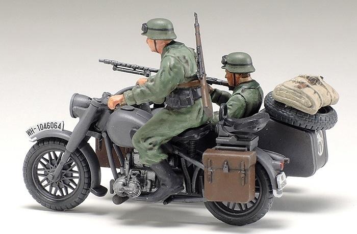 Add some more detail to your 1/48 scale dioramas with this scale model of a German motorcycle and side car. Side cars were paired with motorcycles by German forces in many areas of the WWII conflict, and their excellent off-road ability combined with the bike’s engine power made them a useful asset in transporting soldiers and equipment, some even being mounted with machine guns.