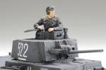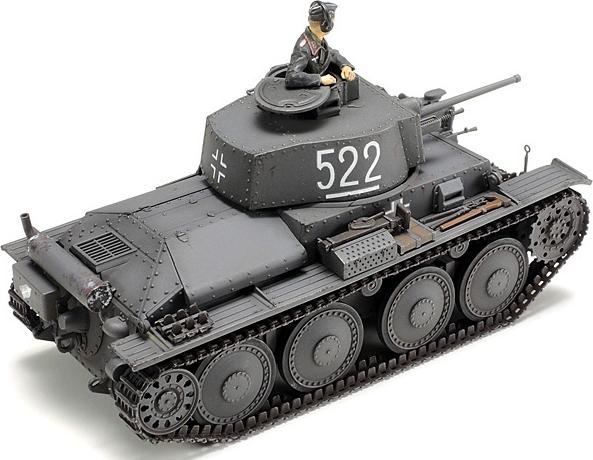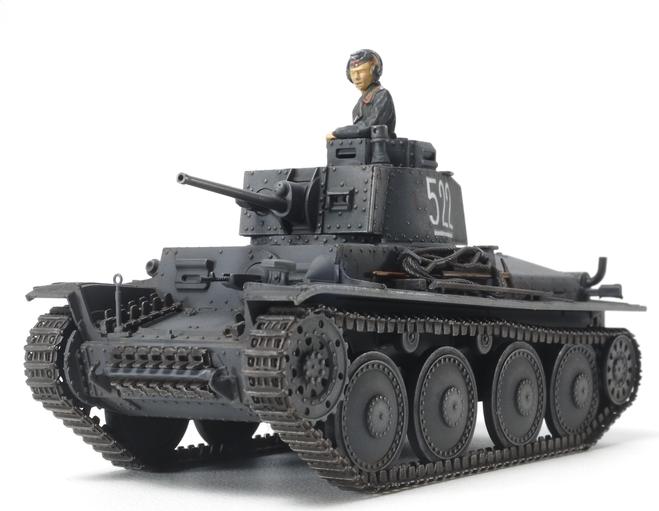 This is a model of the German light tank 38(t) in 1/48 scale. The 38(t) was designed and entered production for the Czechoslovak Army as the LT vz. 38, however before any could be delivered Germany occupied then divided the country. They rated the tank highly, ordering continued production of the initial lot of 150, renaming it the 38(t) with (t) denoting its Czech origin. It went on to serve as the front-line tank for the Wehrmacht in early WWII, from the initial operations in Poland up to and including Operation Barbarossa, the invasion of the Soviet Union in June 1941. It wielded a 37mm gun with 90 rounds on board, a coaxial 7.92mm MG37(t) machine gun, and another MG37 on the front left of the vehicle. 42km/h was squeezed out of the 6-cylinder engine. Ausf.E/F 38(t) variants featured doubled front armor thickness at 50mm, with 30mm on the hull and turret sides. 525 were produced in the period from November 1940 to October 1941.