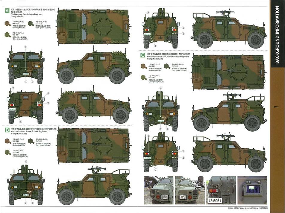 This Tamiya 1/35 scale model kit recreates a domestic-specification Japanese Self Defense Force Light Armored Vehicle. A previous release kit (item 35275) depicted an Iraq PKO spec vehicle. The Light Armored Vehicle is an integral part of Japan Ground Self-Defense Force (JGSDF) infantry units, key to the emphasis placed on mobility by recent policy changes. Around 1,900 in total have been provided to the JGSDF and the JASDF air arm.