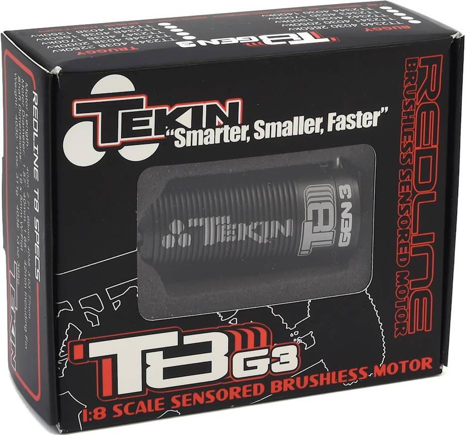 This is the Tekin Redline T8 GEN3 4038 Can, 2250kv Brushless Sensored Motor, made specifically for 1/8 Truggy use. Tekin's T8 GEN3 racing motors are racing performance defined. With a stronger rotor, updated stack features and lower resistance, the T8 GEN3 motors are a versatile, unmatched and advanced power delivery system. Relentless amounts of torque and power are at your disposal with industry-leading RC motor technology. Coupled with an RX8 GEN3 (TEKTT2302) utilizing Tekin's D2 Dual Drive Technology, the T8 GEN3 packs efficiency and precise control through the entire RPM range.
