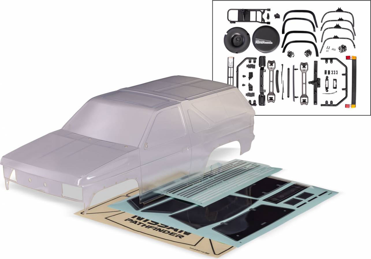 Traxxas Body, Nissan® Pathfinder® (1988) (clear, requires painting)/ decals/ window masks (includes grille, side mirrors, door handles, windshield wipers, clipless mounting, hardware)