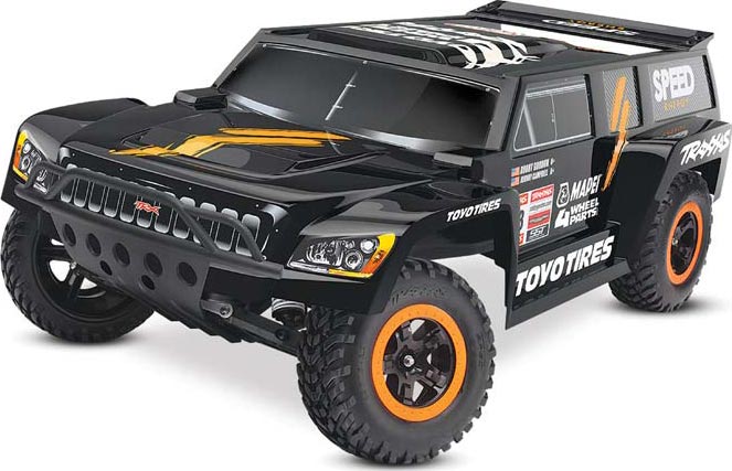The award-winning Traxxas Slash puts you in the driver's seat for intense, high-flying off-road action. Robby's full-size Dakar truck embodies the spirit of Traxxas R/C with its 6.0 liter LS2 V8 racing engine, sand-shredding horsepower, 20-inch suspension travel, and desert-conquering durability. The Dakar Slash brings all the action home so you can experience high-speed head-to-head competition no matter what place the terrain takes you--even water, mud, and snow thanks to Traxxas' exclusive waterproof electronics!