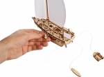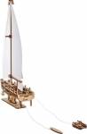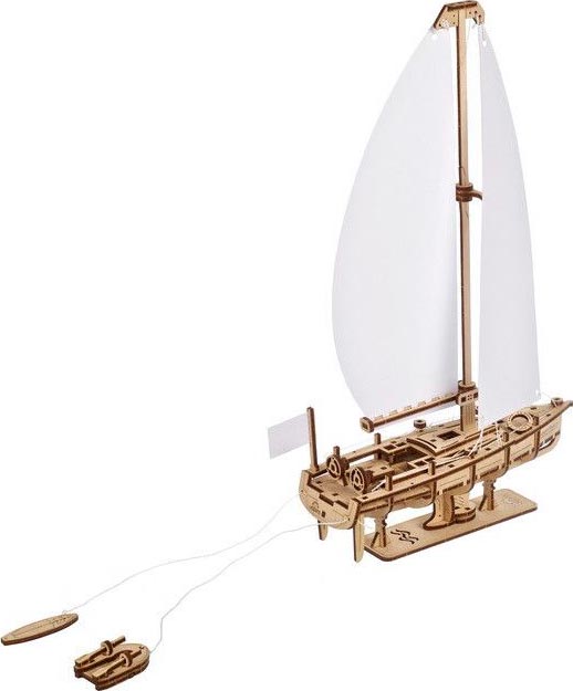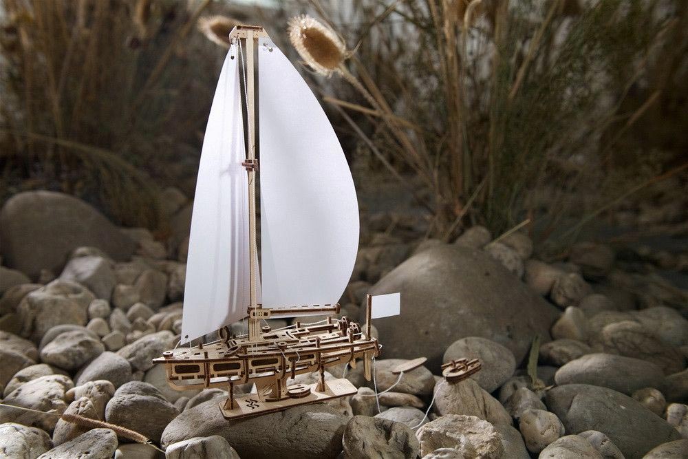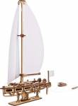 Catch the wind, feel the salt breeze, take to the seas or go island hopping in the stunning Ocean Beauty Yacht by Ugears. This DIY wooden model sailing vessel is a beautiful static model, with two gleaming white paper sails, and comes with its own sturdy stand for display on your shelf, mantle or desk. The model is somewhat different from other Ugears mechanical models in that the Yacht doesn't have gears and isn't propelled by a spring or rubber band motor—it's rather meant as a handsome display piece for your home or office decor.