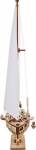 This DIY wooden yacht model has a curved mainsail with swinging boom, and a triangular jib, both fixed to a tall mast with spreader for the starboard and port shrouds. Stanchions and rope railing line the deck. Two life preservers and an anchor add further touches of realism. On the stern is a flagpole for flying your yacht ensign—leave the white paper flag clean, color it, or affix a sticker or printout of whichever national flag or yacht club flag you choose.