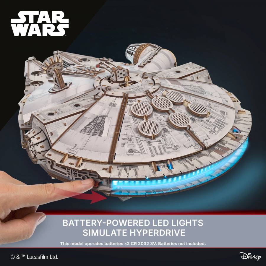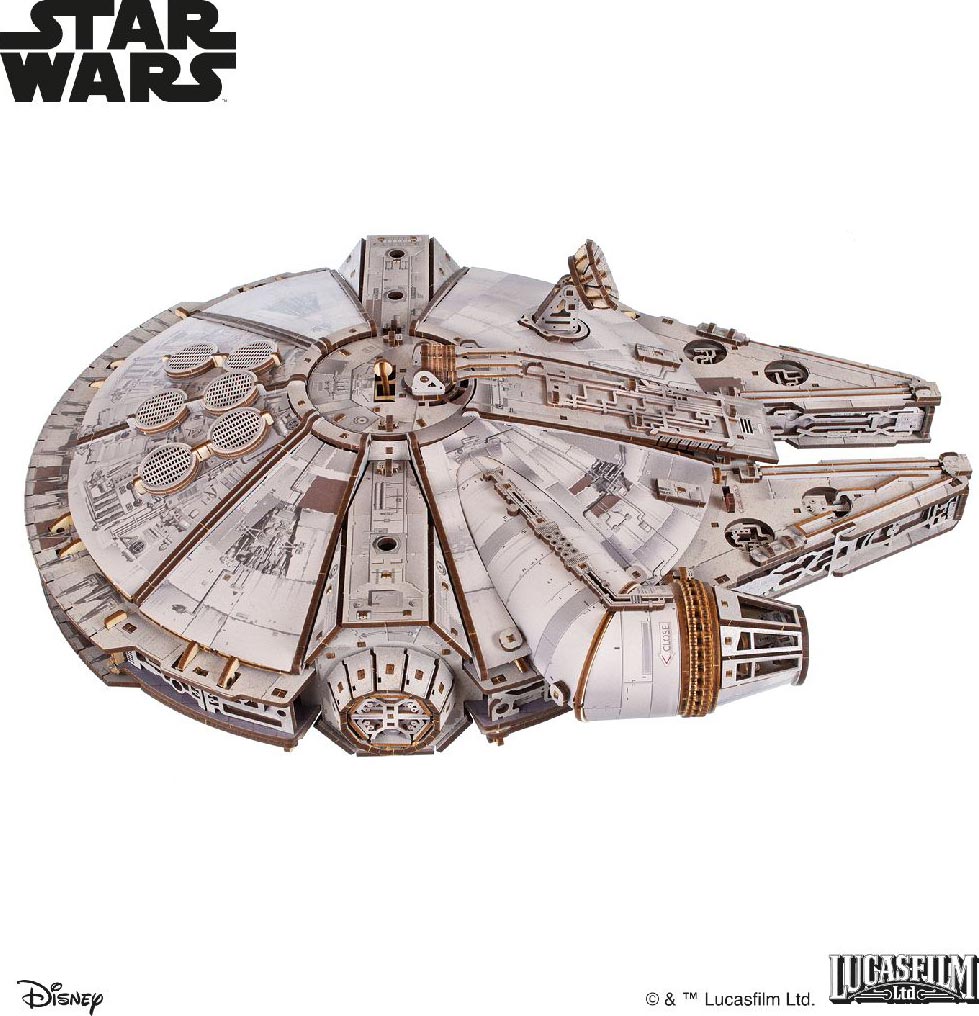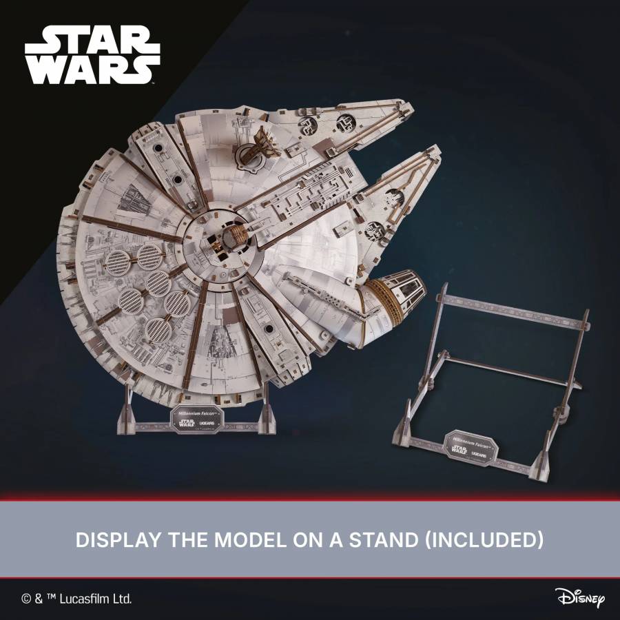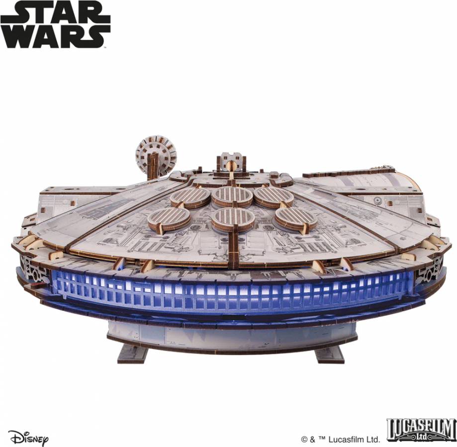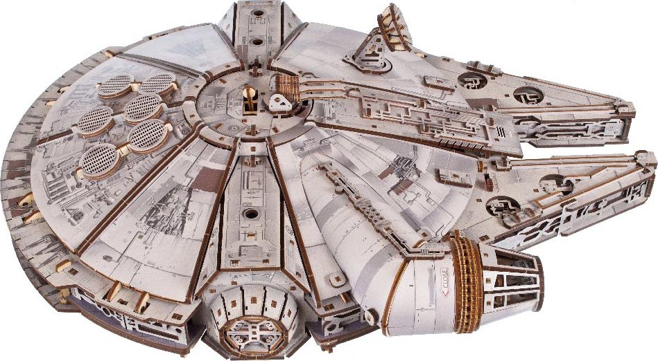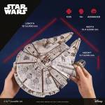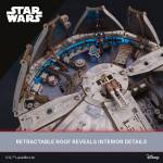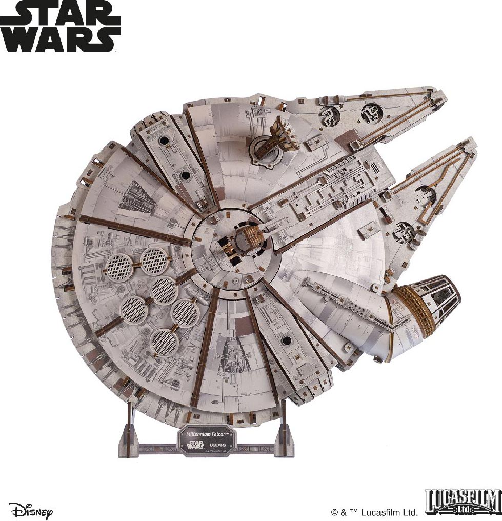 Movable elements include the boarding ramp, cargo bay door, landing gear, gun turrets, rotating 360° antenna, and retractable roof that opens to display the amazing detailed realism of the ship's interior. High density fiberboard and cardboard elements bring added durability and interest. Build and own a piece of cinematic history with this absolute showstopper 3D model of the Millennium Falcon™.