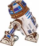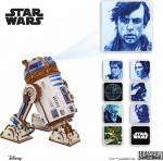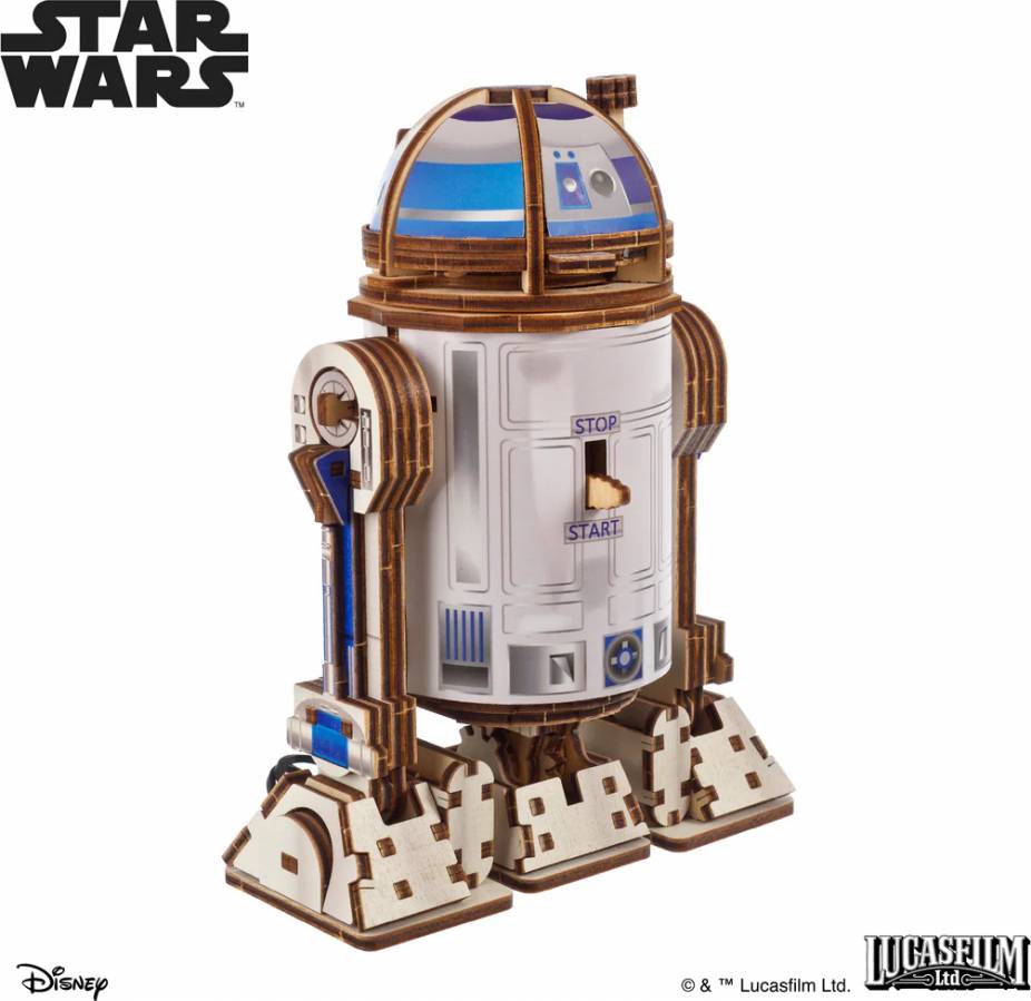 R2-D2 by Ugears runs thanks to a spring-powered internal mechanism. Twist the disc hidden beneath the head to wind it up, set the droid in position, and press the Start/Stop lever to watch him roll forward—just like in the movies. Flip the switch on top to activate the battery-powered mini projector and display colorful Star Wars scenes. The interchangeable slides are stored in a special compartment inside the body and can be swapped out using the included tool. Whether standing tall or leaning into action, this clever little droid is always ready with a message from the stars.
