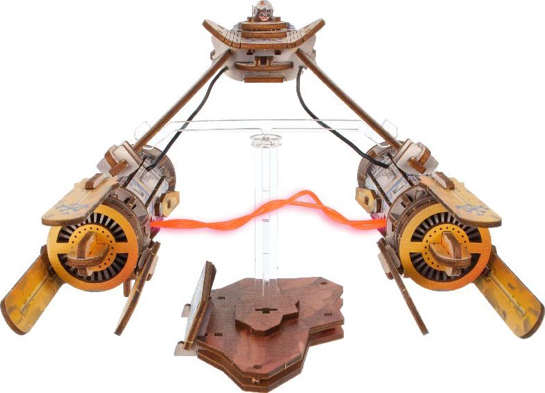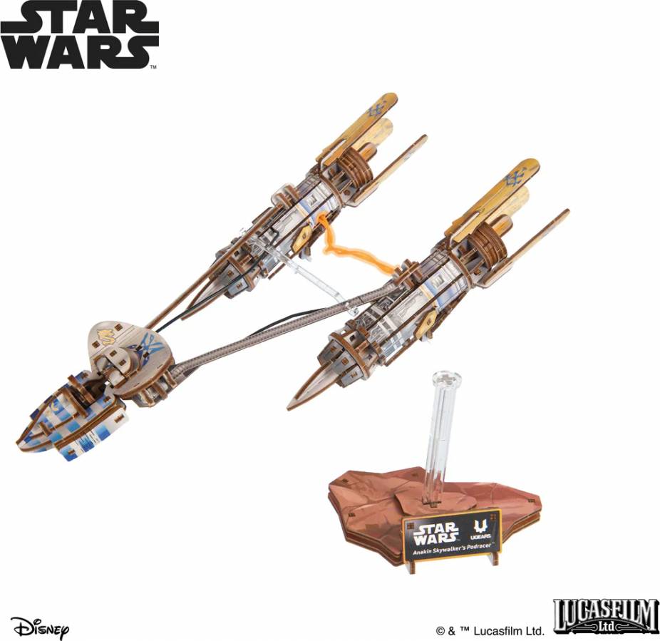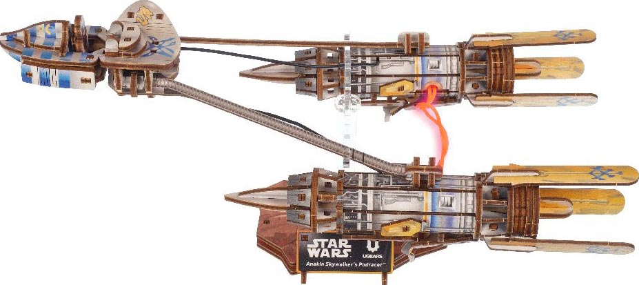 Anakin Skywalker’s Podracer by Ugears captures the thrill of podracing with a unique balance mechanism that lets the craft tilt, sway, and turn—simulating its hovering flight. Anakin Skywalker sits inside the cockpit, and the side door opens manually. The twin engines are joined by flexible LED wires powered by battery, creating the signature electric arc effect seen in the movie. To activate the lights, simply flip the switch located underneath the engines—and watch the arc come to life. If the battery runs out, no problem: the battery slot can be removed from the body for easy replacement.