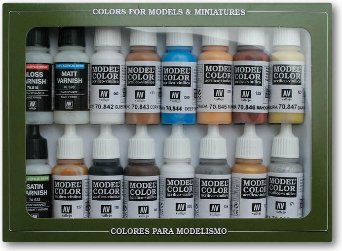 Set of 16 Model Color references for painting models, figures and dioramas. Contains 17 ml./0.57 fl.oz. (with eyedropper) bottles and a color chart.