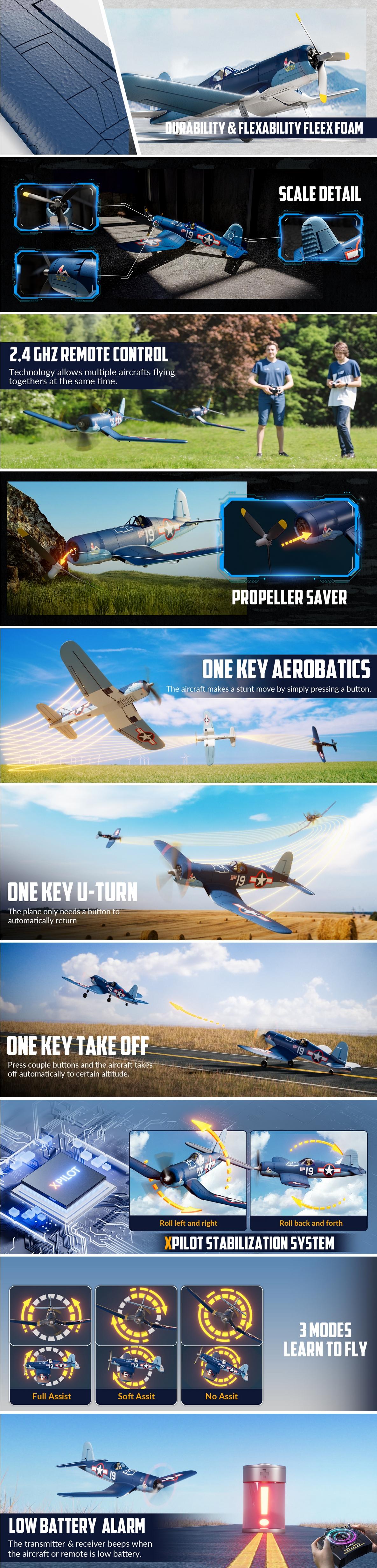 VOLANTEXRC RC Plane - Corsia F4U “Unbeatable” The Corsair F4U “Unbeatable” is a meticulously designed and high-performing airplane. Thanks to the integrated XPilot gyro stabilizer and the newly upgraded, larger motor system, it flies smoothly, reacts quickly, and can perform aerobatics even in light wind conditions. The product's design is more realistic, with an increased size that makes it look more like the real Corsair F4U. What's more, the rich details on the plane, from the exterior paint job to the intricate components, make it a true collector's item and a joy to fly for enthusiasts.