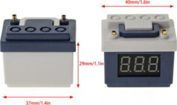 Voltage alarm designed to look like a vehicle battery for 1/10 RCs.