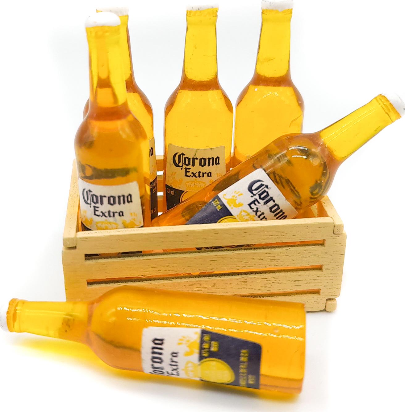 Set of (6) 1/6 scale beer bottles and wooden crate.