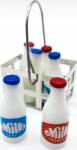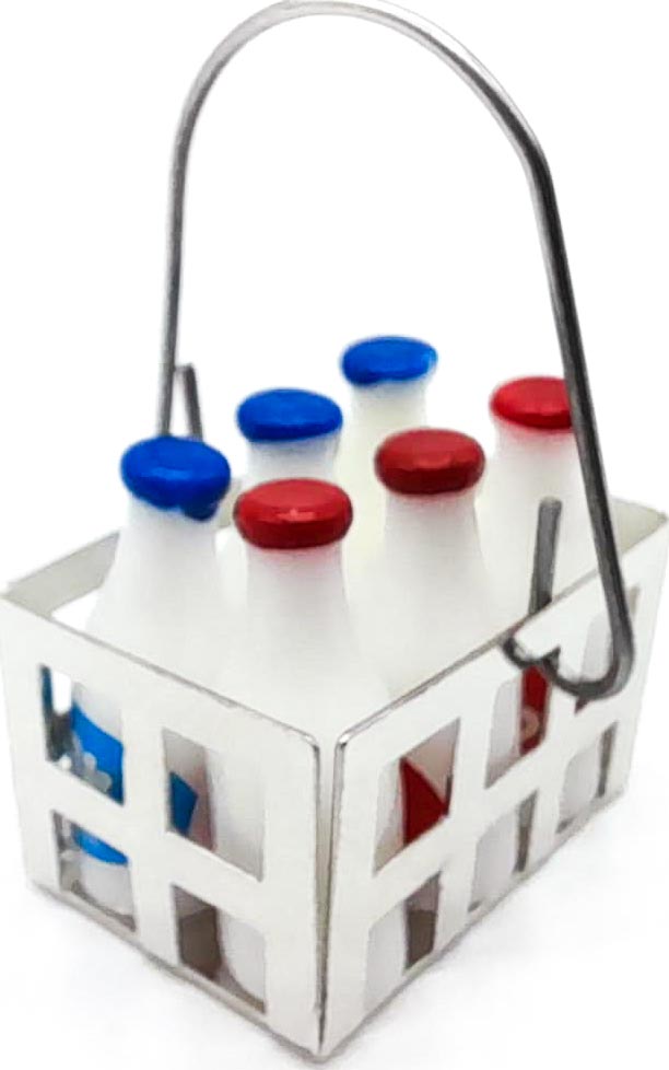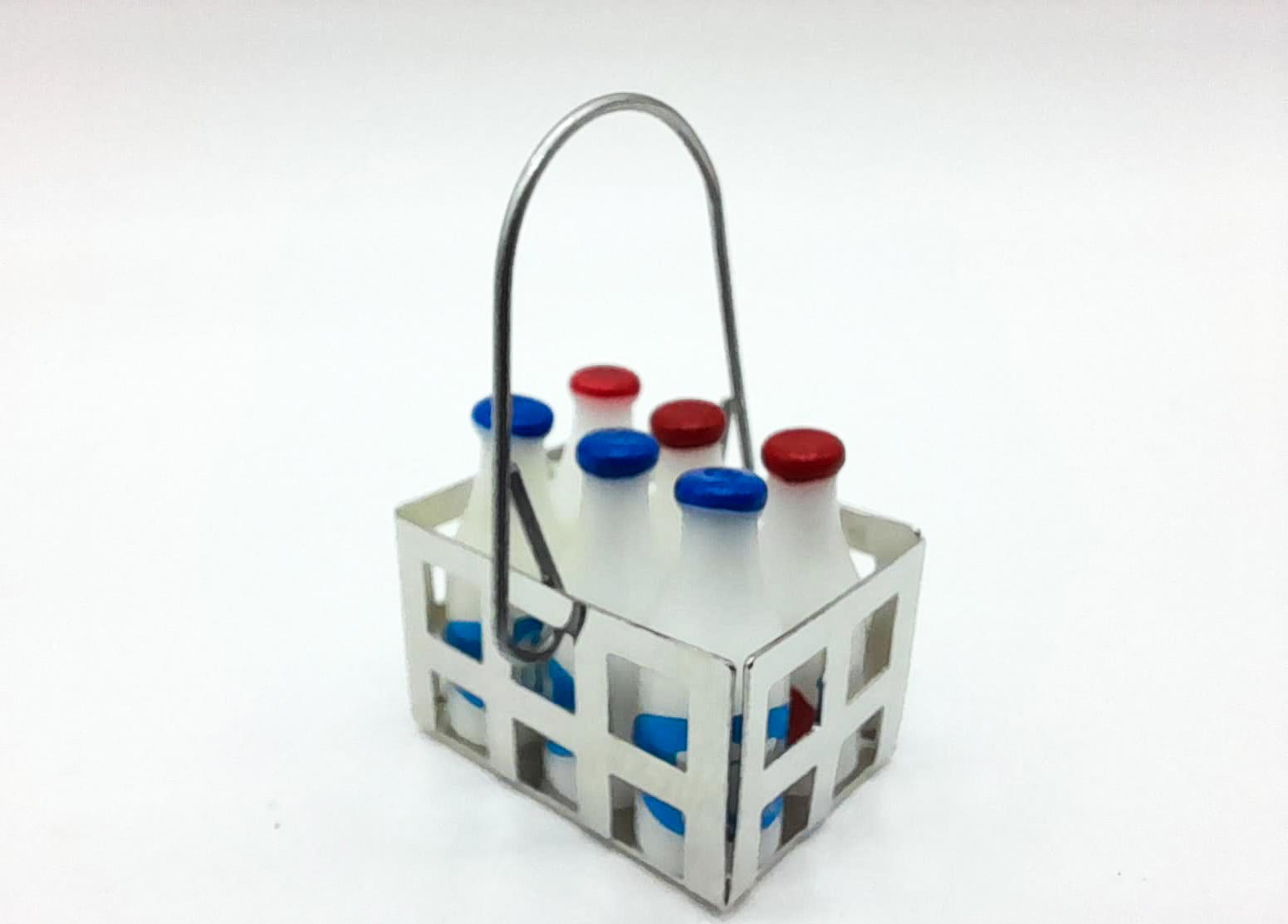 Set of (6) 1/10 scale milk bottles and metal basket.