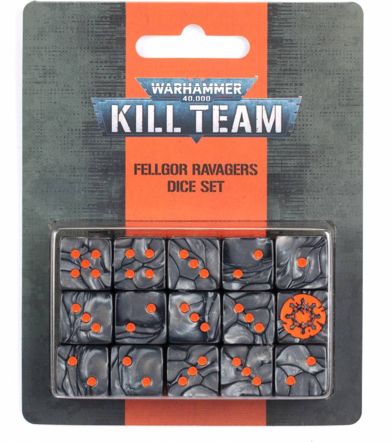 This set includes 15 six-sided dice measuring 16mm along each edge. They are cast in a black pearlescent swirl finish, featuring orange pips and the Fellgor Ravagers Kill Team icon – a variation of the eight-pointed star of Chaos – instead of the 6 face for each dice.