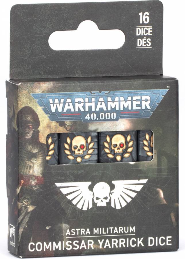 This is a set of 16 six-sided dice with squared edges for use in games of Warhammer 40,000, themed around Commissar Yarrick. They are cast in pearlised black acrylic plastic with gold and metallic red ink markings, and measure 16mm along each edge. The 1-5 facings are traditionally pipped, and each '6' face is decorated with the inspirational icon of Commissar Yarrick. These themed dice are only available while stocks last.