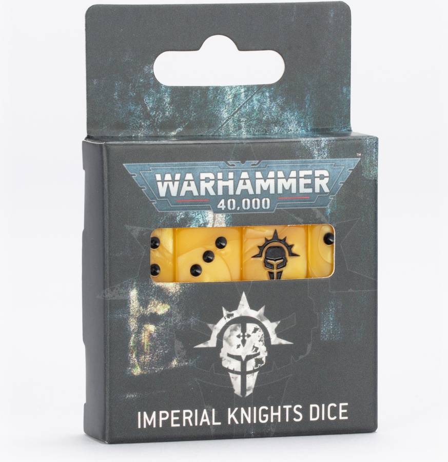 This is a set of 16 six-sided dice with squared edges for use in games of Warhammer 40,000, themed around Imperial Knights. They're cast in pearlised yellow acrylic plastic with black ink markings, and measure 16mm along each edge. The 1-5 facings are traditionally pipped and each '6' face is decorated with the stylised helmet icon of the Imperial Knights.