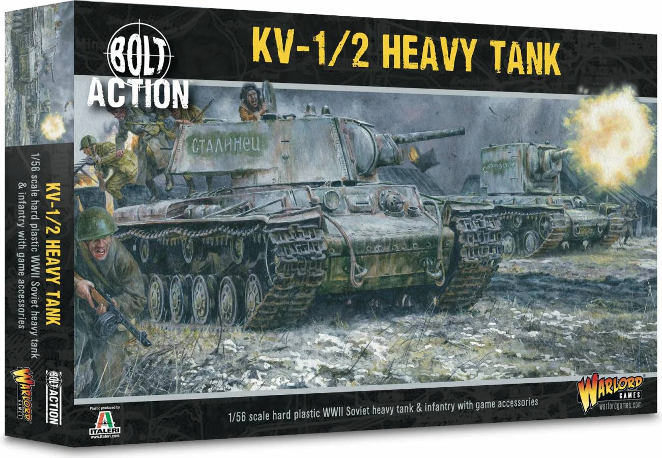 In Bolt Action, this heavy tank mounts a medium-anti-tank gun in its turret, and a number of defensive MMGs. With the Armoured All Round special rule, it will be a difficult beast for your opponent to dislodge! Alternatively, you can build the KV-2 variant, sporting a heavy howitzer in its distinctive boxed shaped turret, and fulfilling a Tank Destroyer slot in a Bolt Action armoured platoon.Bring some of the heaviest armour to your Soviet Armoured Platoons with the KV-1 heavy tank, or field the KV-2 variant, as a close support vehicle! The KV – named after the Defence Commissar Kliment Voroshilov – was a pre-war tank that was thickly armoured all round but also very heavy at 45 tons, making it both un-manoeuvrable and slow. Initially, the 500 KV-1s in service caused the Germans immense problems as the heavy tanks were virtually immune to German anti-tank guns at anything other than point-blank range. This allowed KV-1s to literally overrun German formations in 1941, crushing useless 37mm PaK 36s beneath their broad treads. Some units were still equipped with the KV in the final year of the war, although in diminishing numbers as attrition took its toll upon the survivors. In Bolt Action, this heavy tank mounts a medium-anti-tank gun in its turret, and a number of defensive MMGs. With the Armoured All Round special rule, it will be a difficult beast for your opponent to dislodge! Alternatively, you can build the KV-2 variant, sporting a heavy howitzer in its distinctive boxed shaped turret, and fulfilling a Tank Destroyer slot in a Bolt Action armoured platoon. The box also comes with a sprue of plastic Soviet infantry poised to represent a Tank Riders squad (Armies of the Soviet Union, page 35), a small five-man squad armed with SMGs that can appropriate the KV as an impromptu transport! Box contains one plastic KV-1/2 Heavy Tank, a sprue of Soviet Infantry (6 men), decal sheet, and vehicle damage markers.
