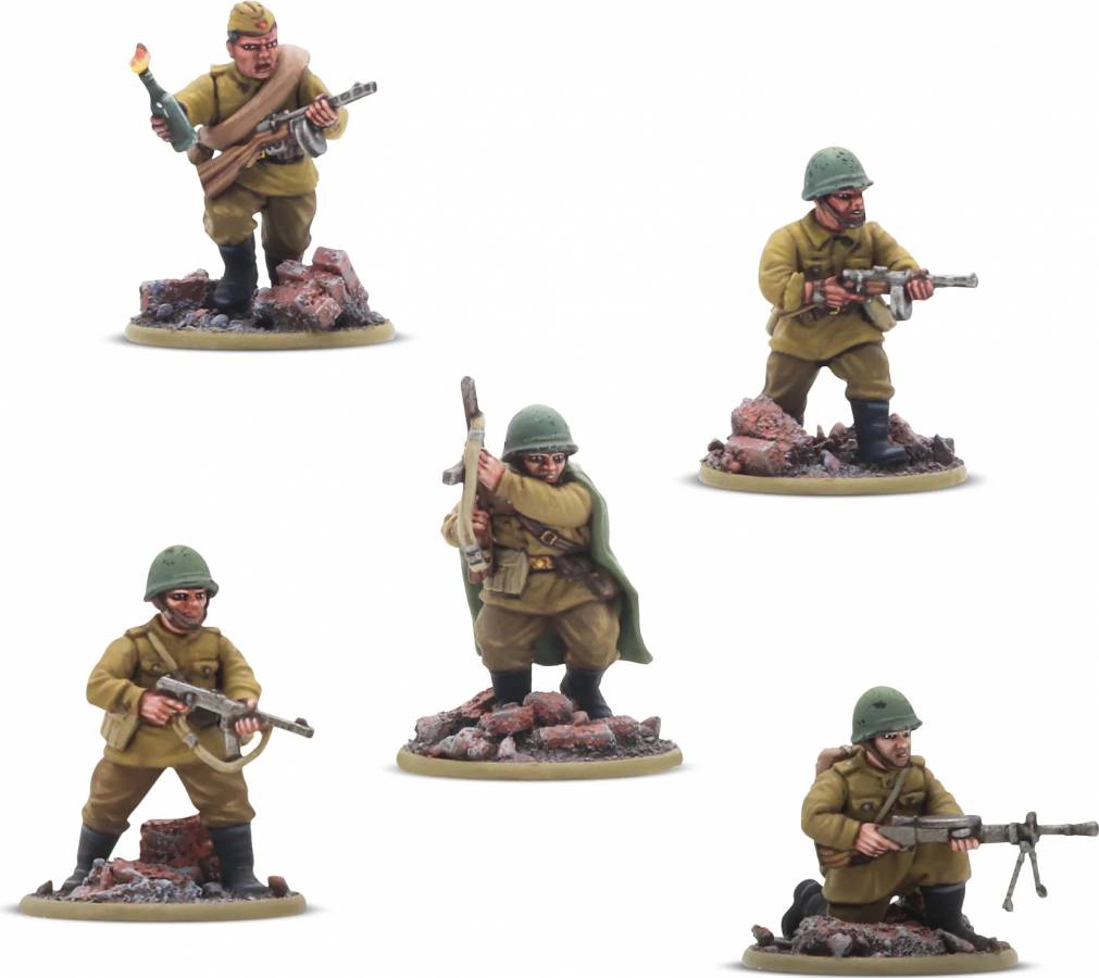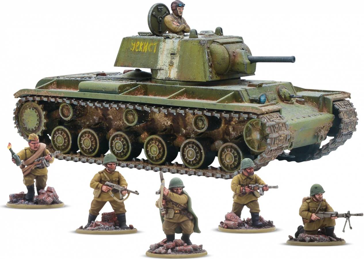 The box also comes with a sprue of plastic Soviet infantry poised to represent a Tank Riders squad (Armies of the Soviet Union, page 35), a small five-man squad armed with SMGs that can appropriate the KV as an impromptu transport!