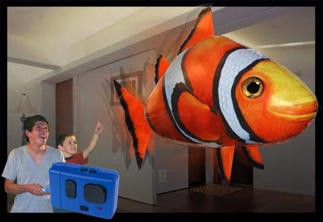 Air Swimmers swim through the air with incredibly smooth and life-like motion. These amazing fish provide hours of remote control indoor fun in even the smallest of rooms (not for outdoor use). They require only four AAA batteries (one in the body, three in the controller) and have complete up, down and 360 degree turning control.